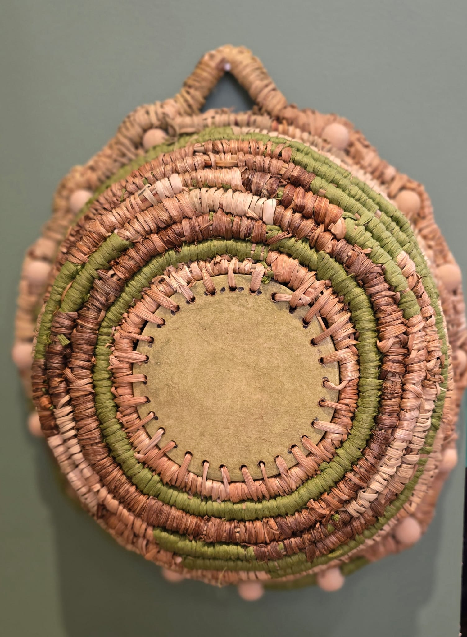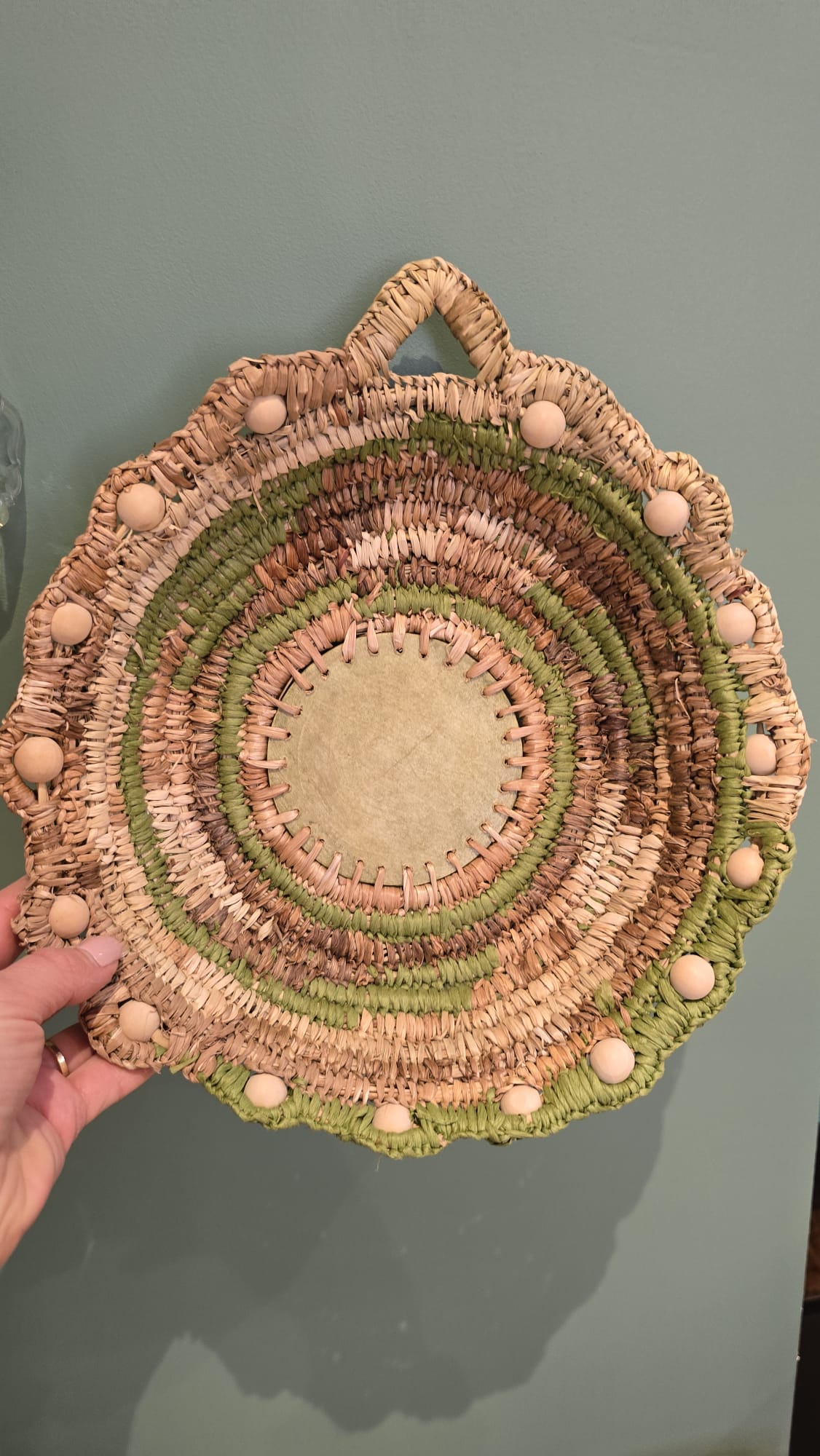 Corbeille réalisée en vannerie spiralée à partir de fibres naturelles : feuilles de carex, d’iris des marais et joncs de massette. Le tressage est enrichi de raphia et de perles en bois, apportant une finition soignée et un aspect authentique.