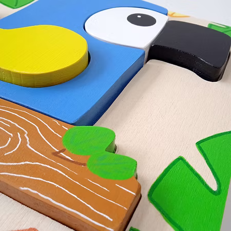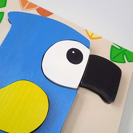 Ce puzzle en bois comprend un plateau de 24,5 × 24,5 cm et 6 grosses pièces faciles à saisir, formant un perroquet coloré.