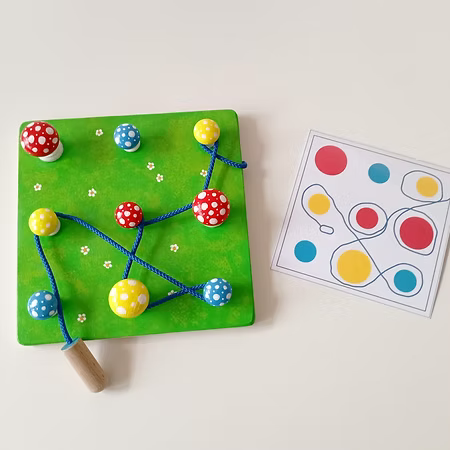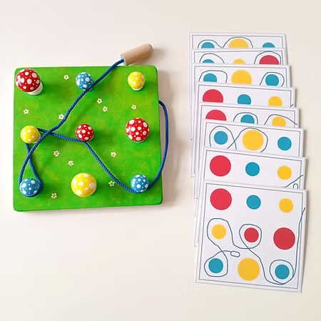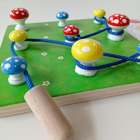 Il se compose d’un plateau de 20×20 cm, de 9 champignons de différentes tailles, d’une ficelle de 80 cm, de 8 fiches plastifiées et d’un sac en lin naturel pour le rangement. Ce jeu de manipulation et de réflexion favorise également l’apprentissage des couleurs et des tailles.
