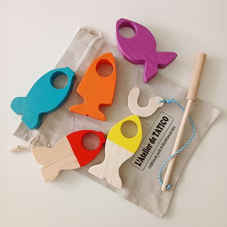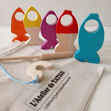 Cette pêche à la ligne comprend 5 poissons colorés de 14 cm et une canne de 30 cm, le tout se range facilement dans un joli sac en lin naturel.