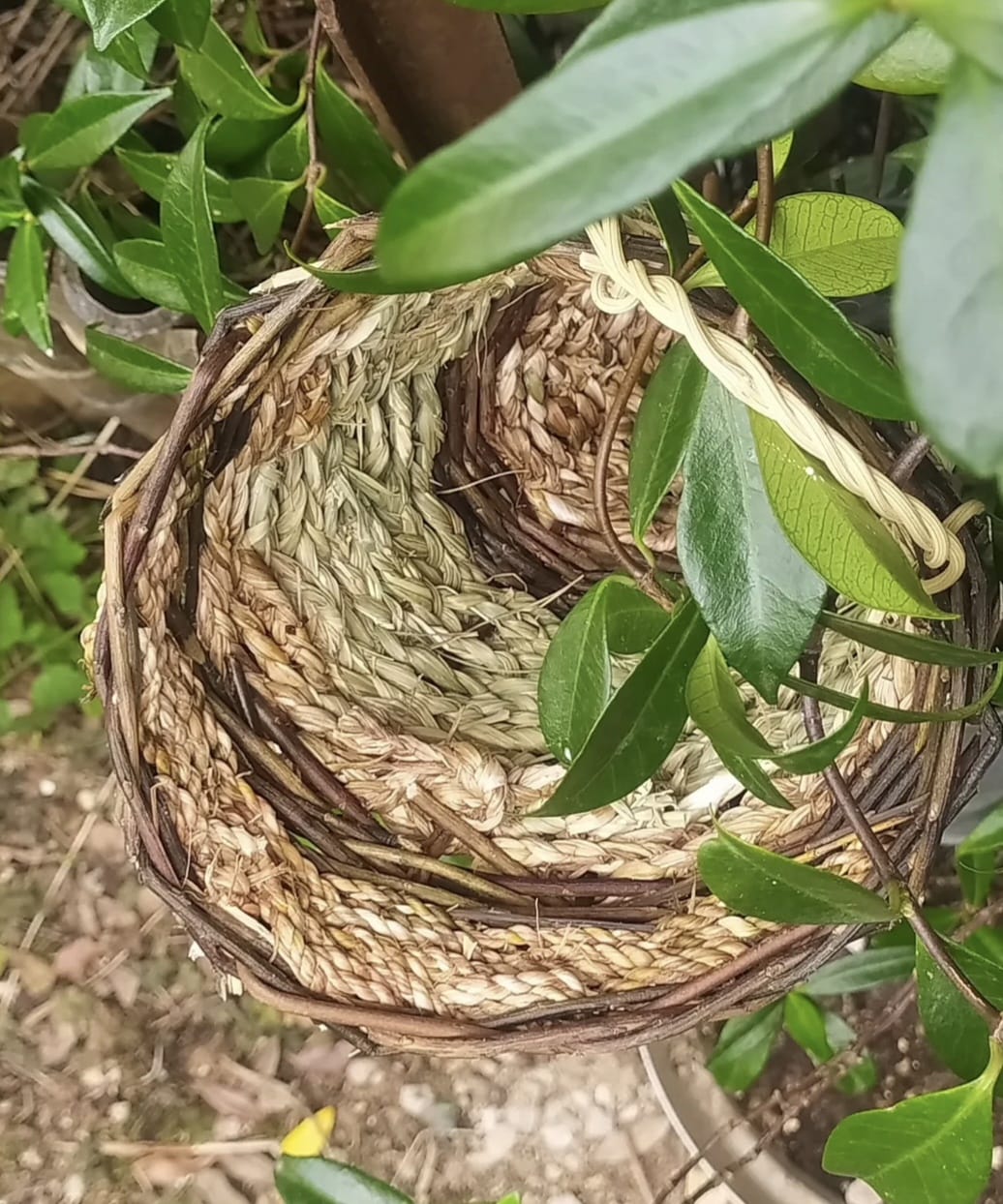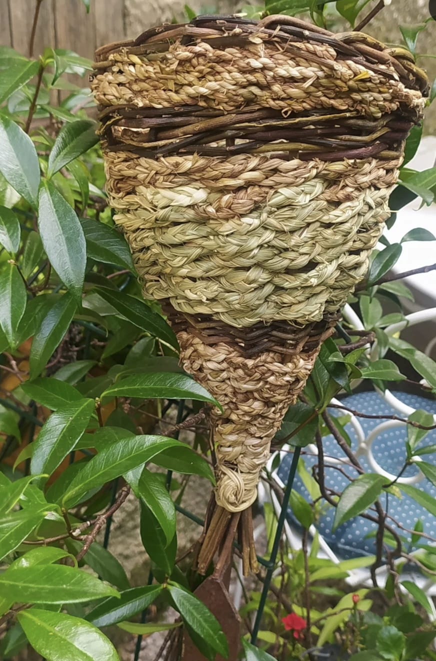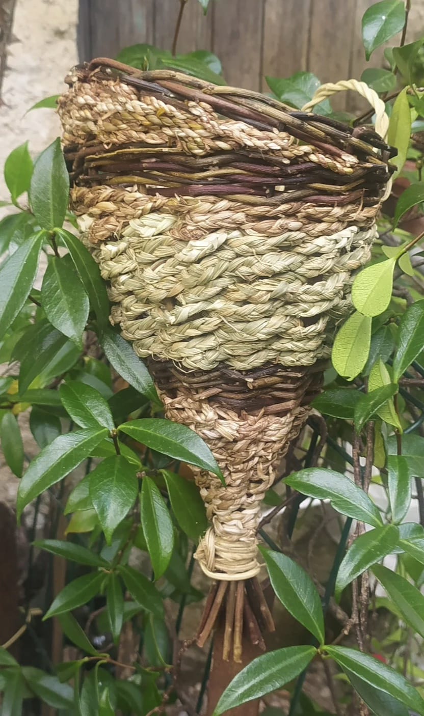 Les montants, la bordure ainsi que les torches sont façonnés en saule sauvage, choisi pour sa souplesse et sa résistance. Le tressage et le remplissage sont réalisés à partir de feuilles de carex et d’iris, offrant une texture naturelle et un jeu de matières subtils. Les nœuds japonais, utilisés en finition, sont exécutés en clématite, ajoutant une touche graphique et délicate à la pièce.